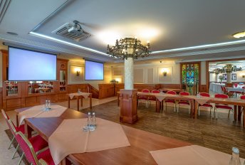Sale konferencyjne w Hotelu Liptakówka urządzone są w eleganckim stylu z przepychem i klasą. Ciemne drewniane meble, jasne ściany oraz czerwone zasłony czy obicia krzeseł sprawiają że pomieszczenia są wytworne i stylowe.