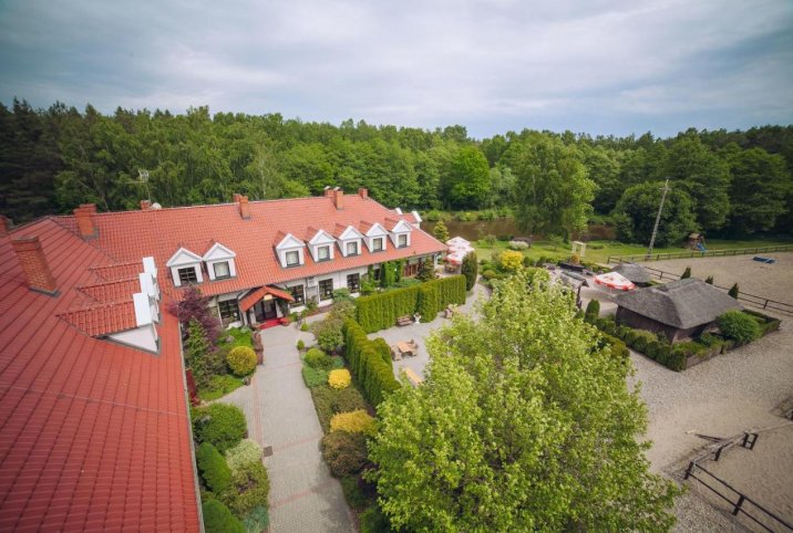 Dodatkowo goście mogą skorzystać z jazdy konnej lub przejażdżki bryczką. Jest też coś dla rodzin z dziećmi – plac zabaw i kącik w restauracji z zabawkami. To miejsce, które łączy wygodę, dobrą lokalizację i sporo możliwości na organizację różnych wydarzeń.