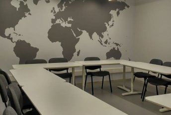 Do dyspozycji klientów Szkoła Językowa udostępnia nowocześnie zaaranżowane, multimedialne sale dostosowane do potrzeb małych i średnich grup. Wielofunkcyjność i przestronność przestrzeni tworzą idealne warunki do pracy, organizacji zebrań, szkoleń, warsztatów, kursów, konferencji oraz wszelkiego typu spotkań biznesowych. Wnętrza wyróżnia minimalistyczny styl wzbogacony o atrakcyjne akcenty kolorystyczne.