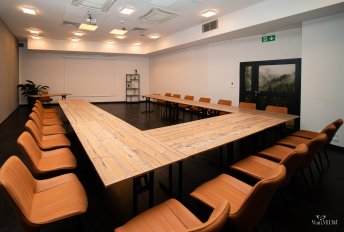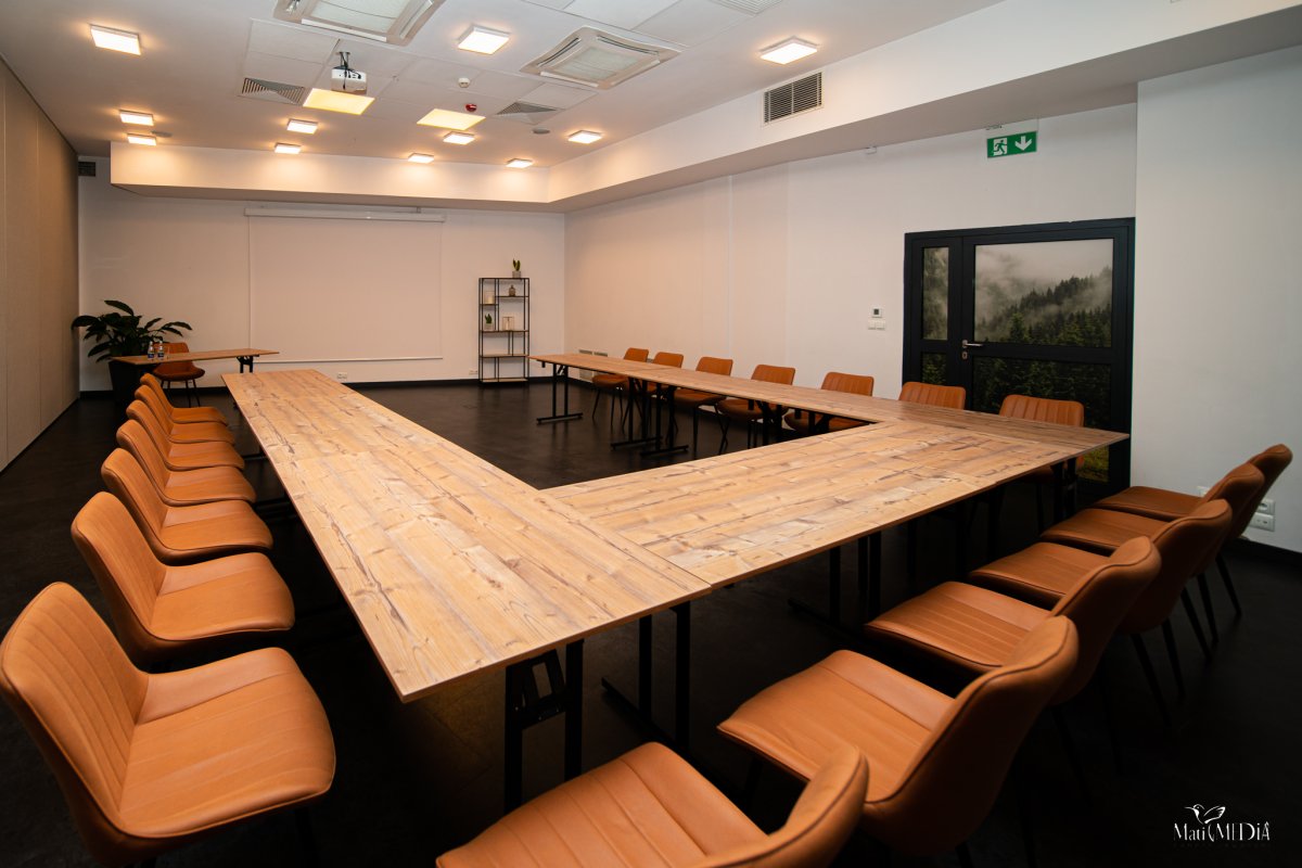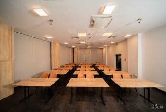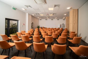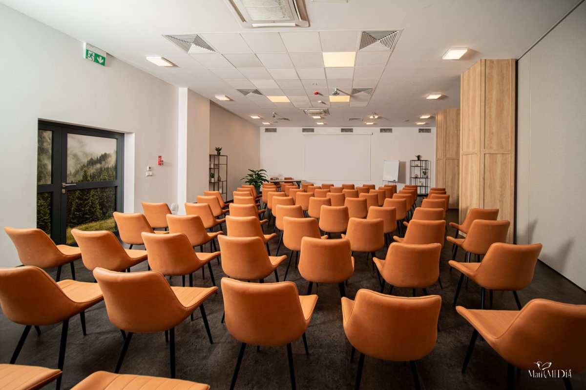 Dysponujemy przestronną salą konferencyjną o wielkości ok. 300 m2, podzielną przez ściany modułowe na trzy mniejsze powierzchnie. Ściany umożliwiają dowolną konfigurację przestrzeni. Ich elastyczny układ pozwala na zorganizowanie równolegle kilku spotkań, szkoleń czy wykładów albo jednej dużej konferencji. W sali konferencyjnej możemy zorganizować spotkanie dla około 250 osób w ustawieniu teatralnym oraz uroczysty bankiet dla około 200 osób. Do dyspozycji oddajemy również przestronne foyer przylegające do sal konferencyjnych.Wszystkie sale są klimatyzowane. Do dyspozycji naszych Klientów w cenie wynajmu sali oddajemy sprzęt multimedialny i audiowizualny: projektor, ekran, mikrofony bezprzewodowe, flipchart z markerami, wskaźnik laserowy, Wi-Fi. Istnieje możliwość ustawienia sali konferencyjnej w układzie: teatralnym, szkolnym, bankietowym.