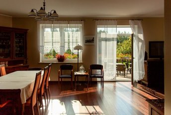 Dom Wakacyjny to wolnostojący dom wynajmowany jako cały budynek o powierzchni 200 m2 z 4 sypialniami dla 9 osób, dużym salonem z TV oraz kuchnią. Gospodarze mieszkają na miejscu, ale korzystają z osobnego wejścia. Kuchnia w Domu Wakacyjnym jest współdzielona przez Gości i Gospodarzy. Istnieje możliwość skorzystania za dodatkową opłatą z posiłków: śniadania, obiady, kolacje, grill.