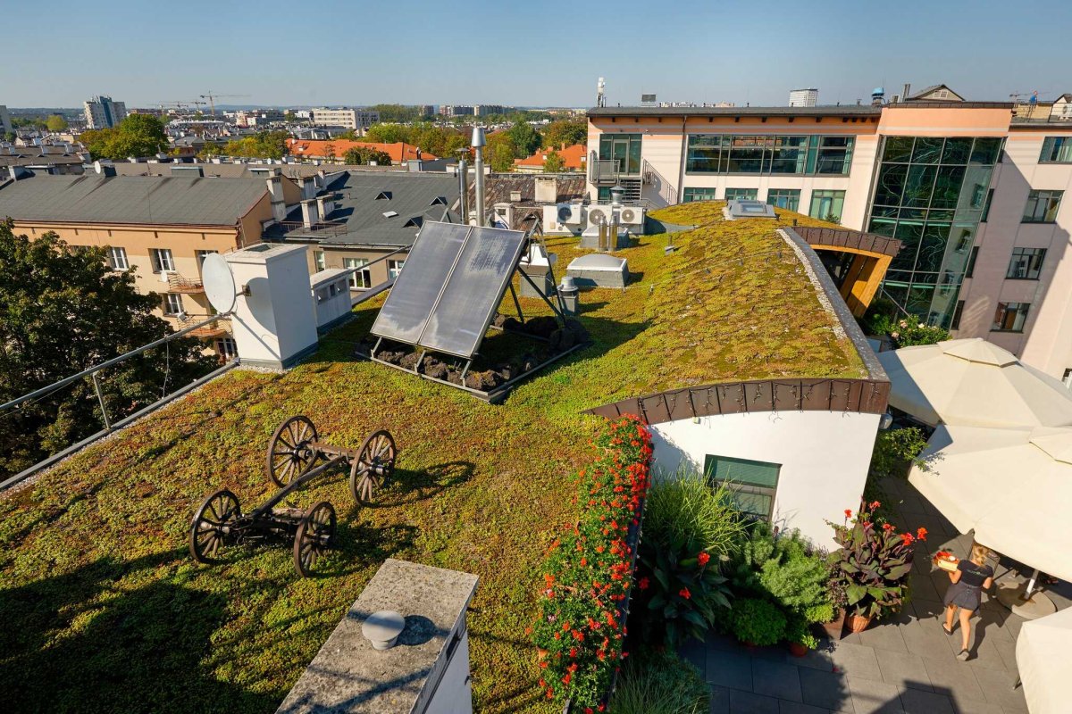 Z pomieszczeń rozpościera się widok na malowniczą panoramę Krakowa.