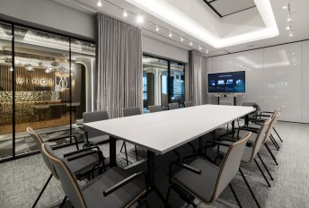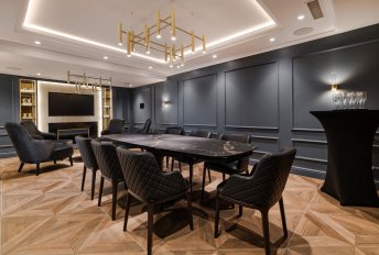 Pokój VIP (34 metry kwadratowe) to eleganckie, kameralne wnętrze idealne na spotkania zarządu, prywatne negocjacje czy ekskluzywne prezentacje. Wyposażone w monitor 65”, system audio, Air Media, przyłącza HDMI oraz komfortowe meble - duży stół z 8 krzesłami, stolik kawowy i 4 fotele.