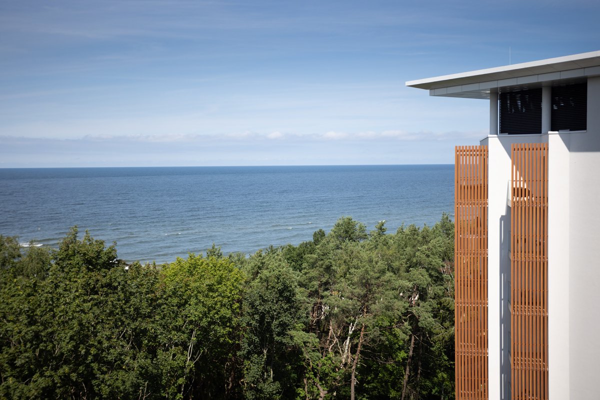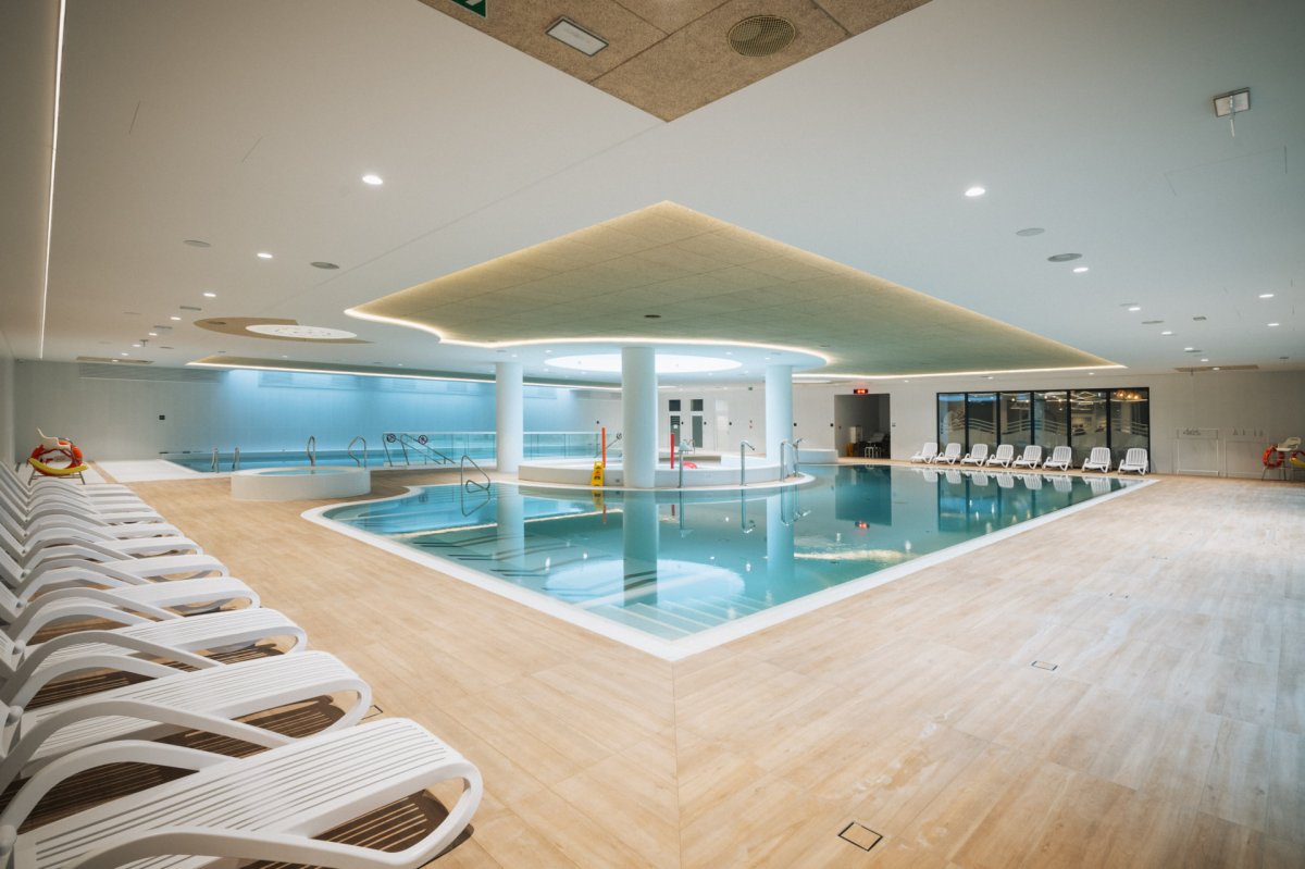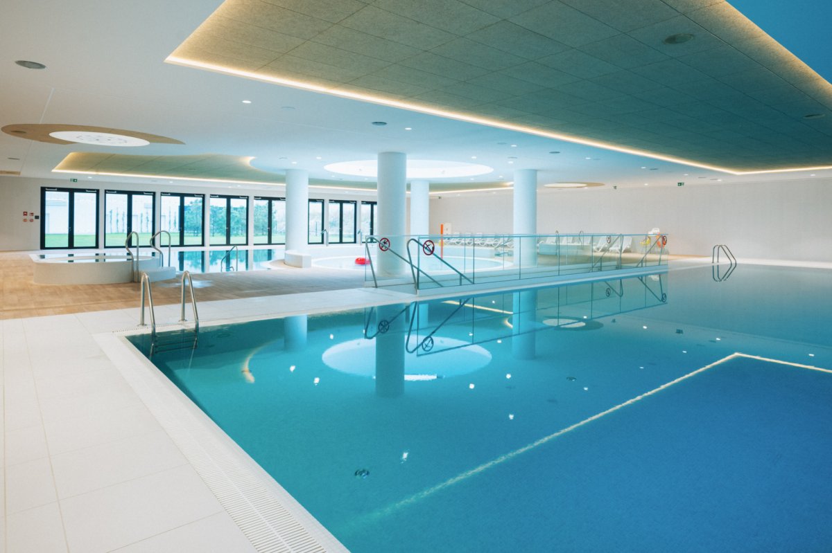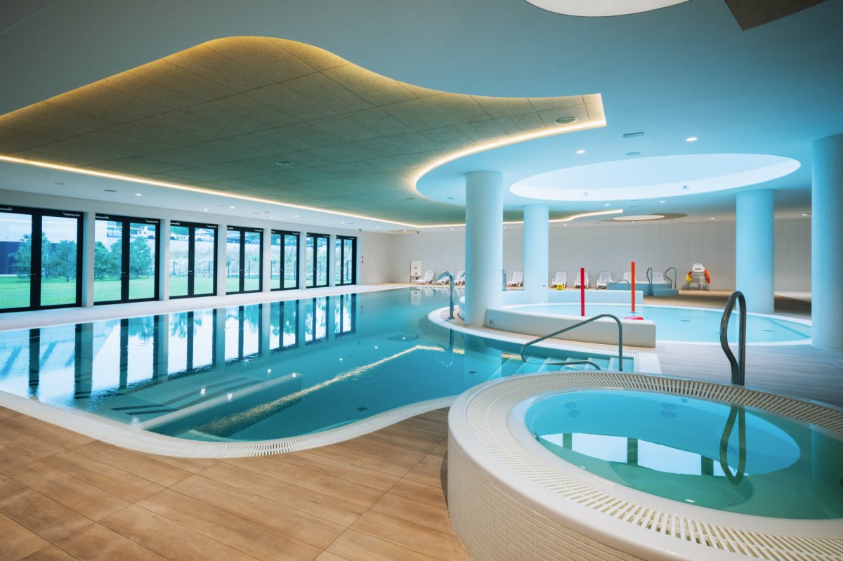 Centralnym punktem jest rozbudowana część wodna, obejmująca pełnowymiarowy basen pływacki oraz basen rekreacyjny, z którego roztacza się widok na nadmorską zieleń. Dla dzieci przygotowano osobny brodzik, zapewniający bezpieczne warunki do zabawy, a całość uzupełnia jacuzzi, idealne na odprężenie po aktywnym dniu.