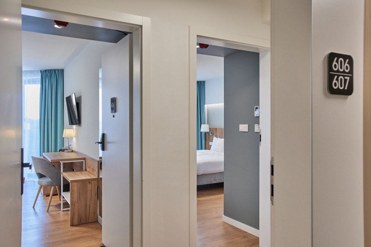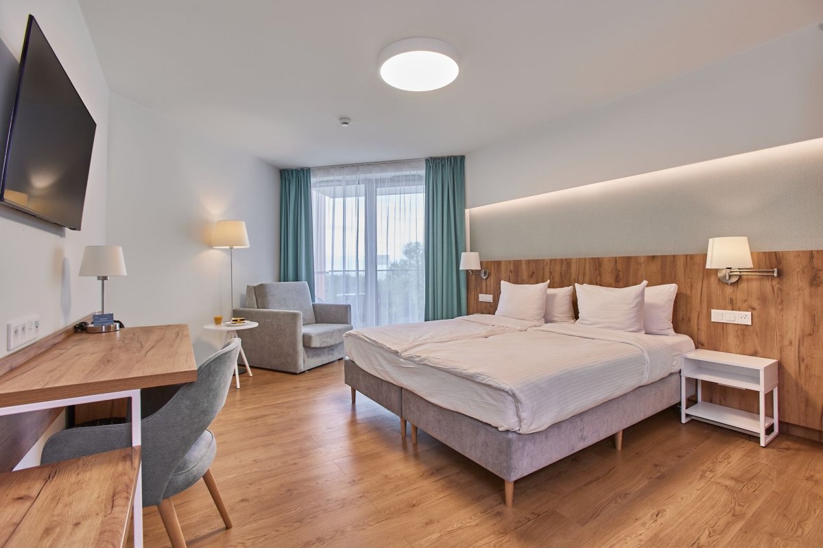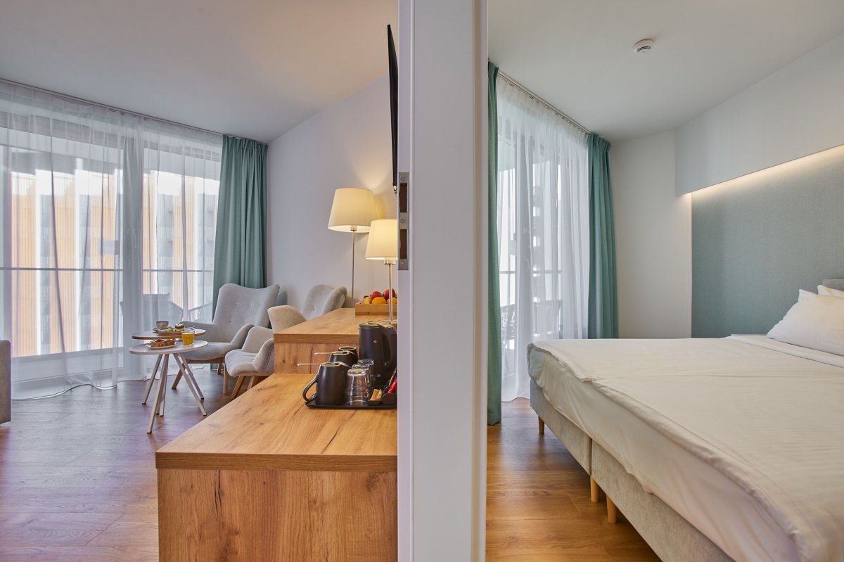 Obiekt dysponuje częścią hotelową z nowoczesnymi pokojami oraz niezależną strefą apartamentową, zapewniającą większą swobodę pobytu i poczucie prywatności. Łącznie resort oferuje kilkaset miejsc noclegowych, co czyni go odpowiednim zarówno na pobyty indywidualne i rodzinne, jak i na zakwaterowanie uczestników konferencji czy wydarzeń firmowych. Wszystkie wnętrza zostały zaprojektowane w spójnym, eleganckim stylu, z naciskiem na wygodę, praktyczne rozwiązania i wysoką jakość wykończenia.