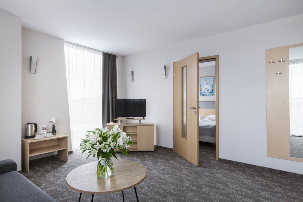Hotel oferuje przytulne, klimatyzowane pokoje, zaprojektowane z myślą o komforcie i wyciszeniu. W każdym z nich znajduje się funkcjonalne biurko do pracy, telewizor oraz szybkie łącze Wi-Fi, co pozwala na pełne odprężenie lub spokojne wykonywanie obowiązków zawodowych.
