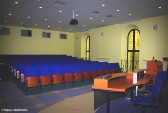Sala audiowizualna pomieści 102 osoby w ustawieniu teatralnym. Znajduje się tutaj podwyższenie odpowiednie dla prelegenta lub osoby prowadzącej spotkanie, a także niezbędny sprzęt audiowizualny. Wyposażenie obejmuje projektor, ekrany oraz mównicę z mikrofonem przewodowym. Pomieszczenie posiada dostęp do światła dziennego, ale istnieje również możliwość zaciemnienia sali, z której można skorzystać na czas prowadzenia prezentacji multimedialnej.