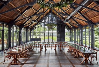 Szklarnia zachowana w stylu rustykalnym, która świetnie sprawdza się podczas