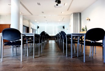 📌 Sala może pomieścić 80 uczestników konferencji, warsztatów lub szkoleń. W przypadku mniejszych spotkań, pomieszczenie można podzielić na dwie części. Większa z nich ma 70,1 m2 i może obsłużyć 50 osób w układzie teatralnym. Natomiast mniejsza sala ok. 45m2 jest