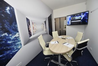 W pomieszczeniach znajdują się obrotowe fotele, solidny stół, listwa magnetyczna, flipchart z materiałami biurowymi oraz telewizor/projektor. Na miejscu jest możliwość drukowania oraz kopiowania. Jasne ściany oraz dobre oświetlenie sprawiają, że we wnętrzach panuje przyjemna, nienachalna atmosfera, która sprzyja komfortowej pracy.