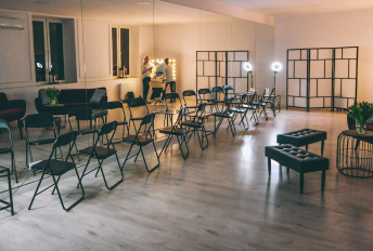 Pierwsza z sal, Industrialna jest niezwykle elegancka - biała z czarnymi i szarymi dodatkami. Posiada trójskrzydłowe, dźwiękoszczelne drzwi, rewelacyjny system oświetleniowy oraz dostęp do światła dziennego.